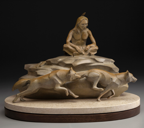 For a long time my interest in sculpting animals allowed no room for the use of the human form as the subject of my art. However, there came a time that my interest in human/animal relationships started to show up in my ideas for sculpture. As the fourth piece in a series I have done on that theme, this image brings my thoughts about those relationships out of a historical context into a more personal, present day realm. This peaceful, mutually comforting scene is one that I know a great many of us relate to.